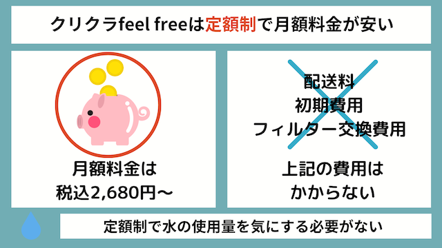 一般的なウォーターサーバーの月額料金が3,000〜4,000円ぐらいかかることが多い中、クリクラfeel freeは2,000円台で利用できるメリットがあります。